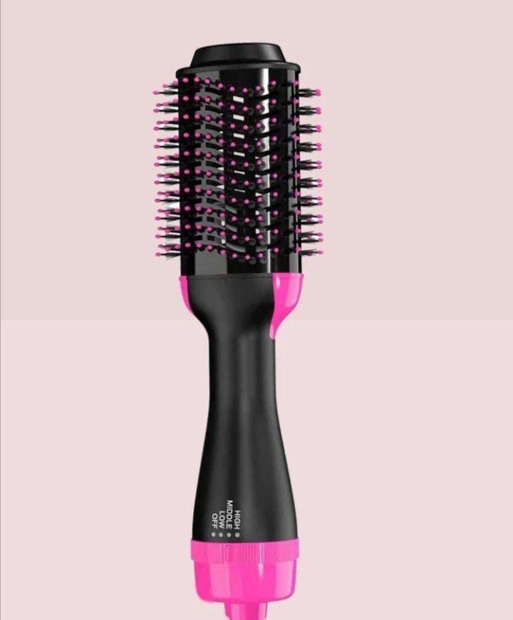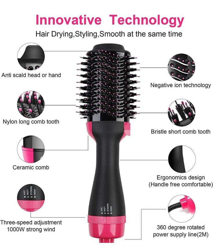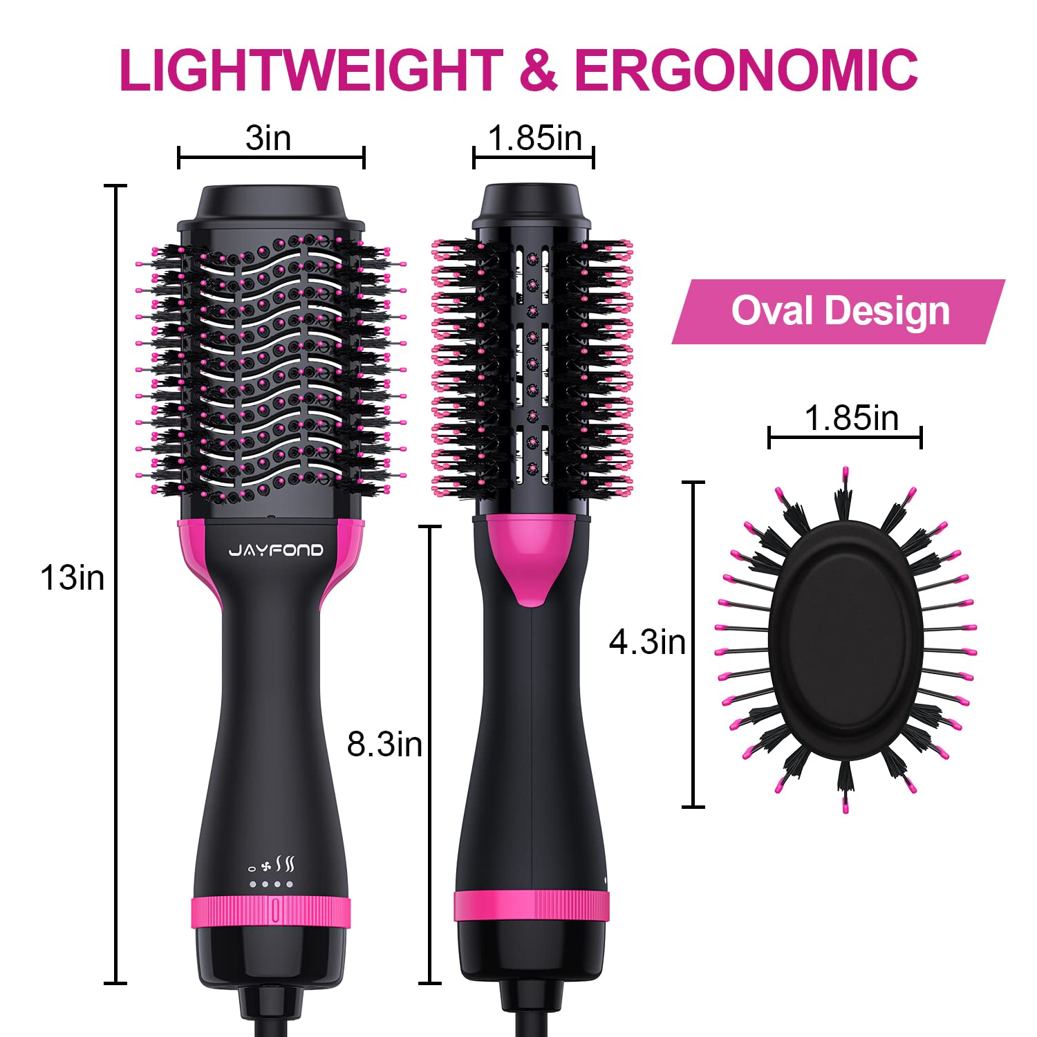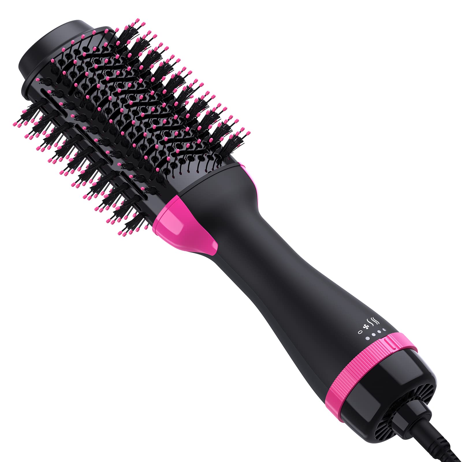 Professional like Salon One-Step Hair Dryer & Hot Air Brush & Blower with no heat damageโข MULTI-FUNCTION HAIR DRYER BRUSH: Professional 4 in hot air brush, perfect combination of dryer, curler, straightener and brush, 4-in-1 hot air brush dryer for blow-drying and hair styling, easily create volumes to your hair.โข IONIC TECHNOLOGY: Tourmaline technology of negative ions saturate the airflow to reduce the size of water droplets for faster drying. This helps condition, smooth and make hair shinier, while reducing frizz and static.โข ADJUSTABLE TEMPERATURE & SPEED: The bottom is a rotary adjustment gear switch,3 heat/speed settings designed to provide just the right amount of heat for different hair types and style needs. Efficient ,fast styling, less time, less damage.โข ERGONOMIC & SAFE GRIP HANDLE: The 360ยฐrotatable wire insures high flexibility to move freely without the cord becoming tangled and damaged, great for using at home or traveling. The hot air brush has unique shape gently curved sides for smoothing and round edges for smooth volume and curled ends. The nylon pin & tufted bristles for easy deta Angle & better grip of your hair.
